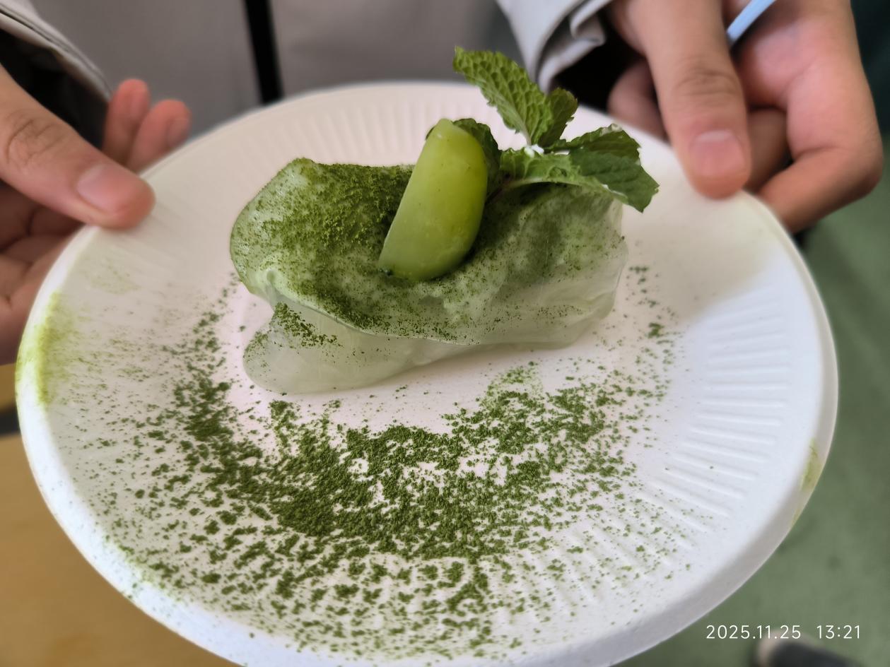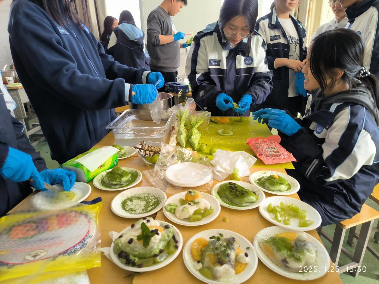 课堂上,同学们在郑大师的指导下,亲手制作融合中法特色的创意糕点。传统法式工艺与中国饮食文化的巧妙结合,不仅让同学们掌握了西点制作的基本技巧,更让他们在实践中感受到跨文化交流的乐趣。看着自己亲手制作的精致点心,同学们脸上都绽放出自豪的笑容。