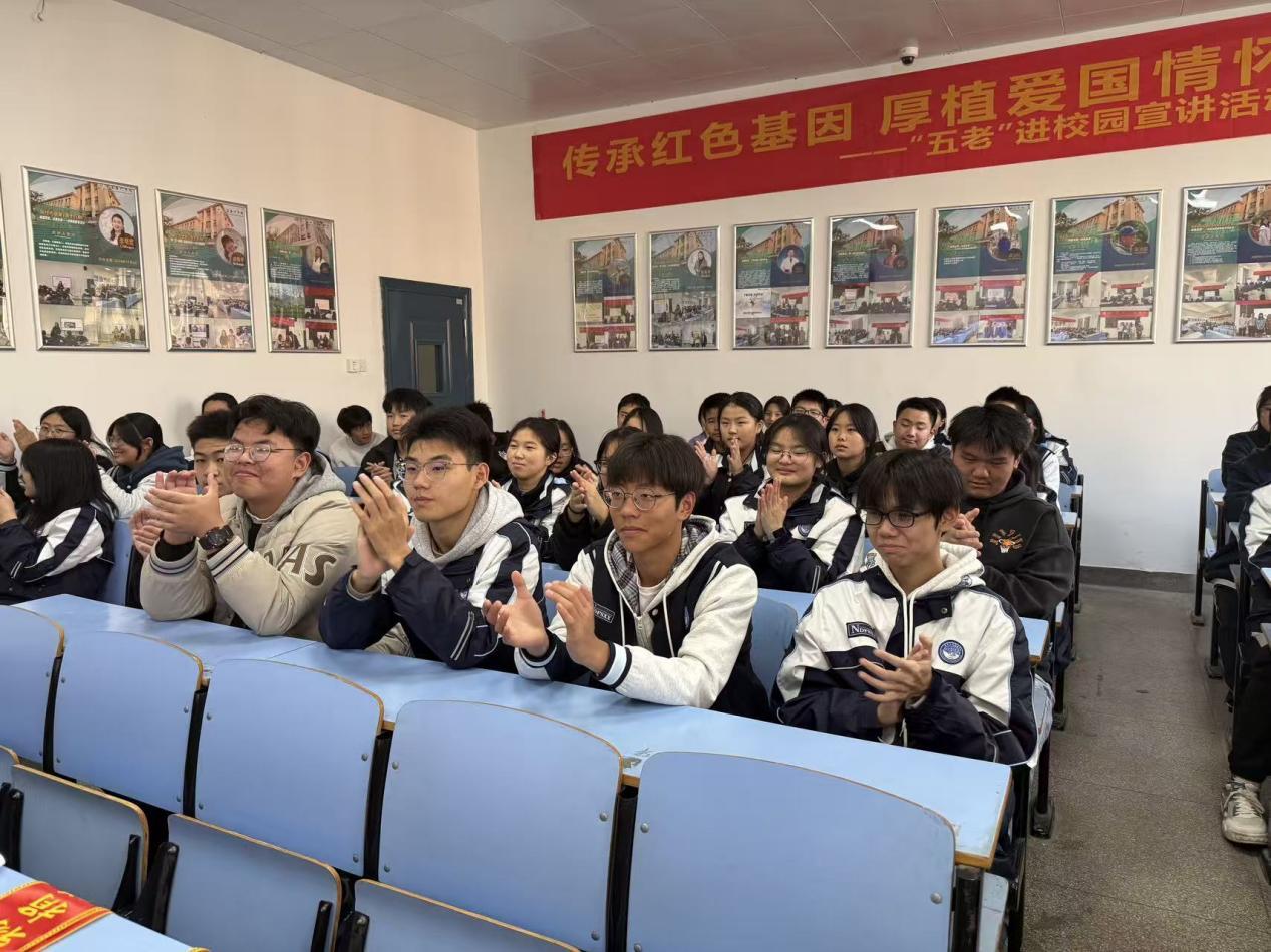 宣讲现场气氛热烈且庄重,感人至深的情节引发全场数次雷鸣般的掌声。同学们的眼神中满是崇敬与向往,更将红色信念铭记于心。“我这辈子就认准三件事:做好人、做好事、传好魂!”王军老兵面向两个班级的学生深情寄语,“你们生在红旗下,长在春风里,恰逢盛世,何其有幸。希望你们都能读懂《最可爱的人》中的牺牲与奉献,让红色成为青春最亮丽的底色,以青春之我、奋斗之我,不负时代、不负韶华!”宣讲尾声,王军老兵即兴朗诵原创诗歌,真挚饱满的情感、铿锵有力的语调将现场气氛推向高潮,爱国之情、报国之志在每一位学生心中久久回荡、绵延不息。